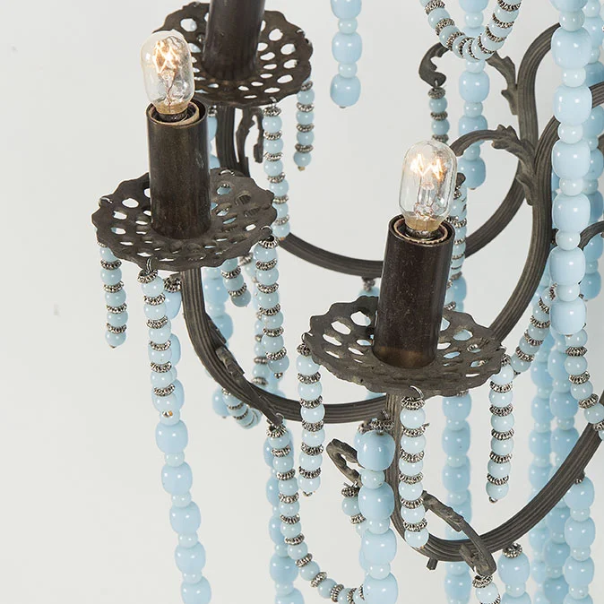 Inspired by the decadent luxury of Villa Nellcote, where the world's greatest rock-n-roll band lived in grand excess and taste. Each sky blue bead is strung by hand around hand cast sold brass fittings. 9 candles